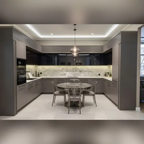Серая п-образная кухня Виктория — п‑образная планировка дарит возможность создать кухню мечты с максимальной пользой. Три стороны мебели позволяют разместить технику, шкафы и столешницы так, чтобы процесс готовки был лёгким и приятным. Вместительность сочетается с продуманной эргономикой.